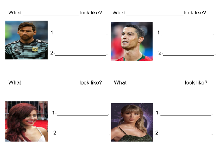 AA2. Complete the space in blank of the physical appearance questions. Then, write two sentences about famous people physical appearance.Version en ligne Read the instructions carefully. par Todos los Estudiantes 1 2 3 4 5 6 7 8 9 10 11 12 1 2 3 4 5 6 7 8 9 10 11 12