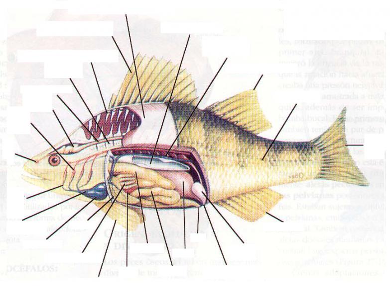 Peces óseos - anatomía internaVersion en ligne Peces Octeíctios (óseos) par Jane Austen enthusiast 1 1° aleta dorsal 2 miómero 3 vejiga natatoria 4 riñon 5 2° aleta dorsal 6 línea lateral 7 aleta caudal 8 aleta anal 9 vejiga urinaria 10 abertura urogenital 11 ano 12 ovario 13 intestino 14 estómago 15 bazo 16 aletas pelvianas 17 ciegos pilóricos 18 hígado 19 ventrículo 20 bulbo arterioso 21 arteria branquial aferente 22 bulbo olfatorio 23 arteria branquial eferente 24 encéfalo 25 medula espinal 26 vértebra 27 radio de soporte de la aleta
