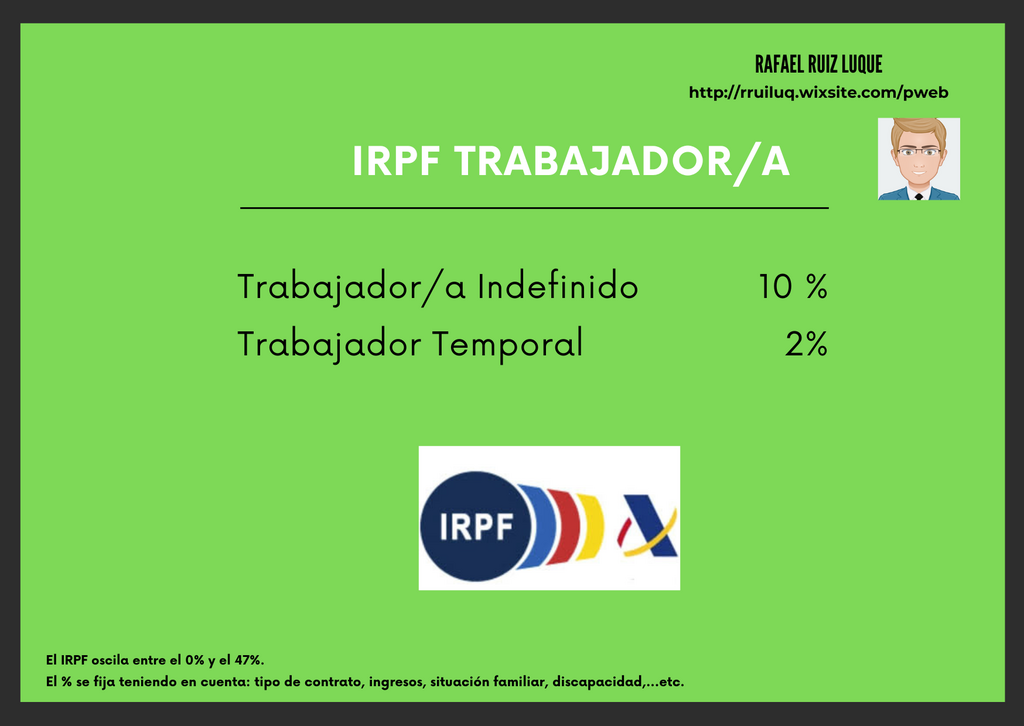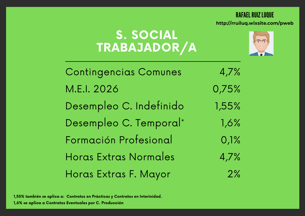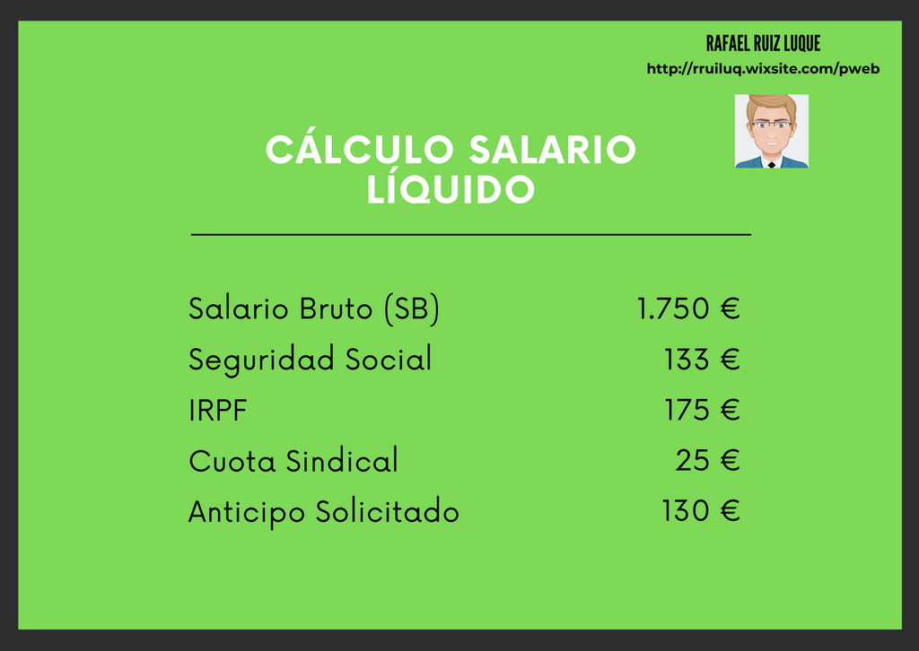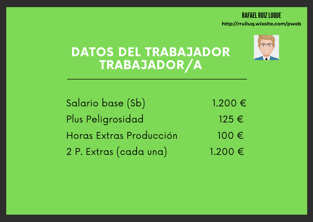 Froggy Jumps El Recibo de Salario (CE 3D)Version en ligne Siguiendo cada uno de los pasos del método de cálculo de una nómina soluciona las siguientes cuestiones que se te plantean sobre la retribución de un trabajador. par Rafael Ruiz Luque 1 ¿Cuál es el importe del Salario Bruto de Mayo? a 1.425 €/mes b 1.625 €/mes c 2.625 €/mes 2 ¿Cuál es el importe del Salario Bruto de Junio? a 1.425 €/mes b 1.625 €/mes c 2.625 €/mes 3 ¿Cuál es el importe del Salario Bruto Prorrateado de Junio? a 1.425 €/mes b 1.625 €/mes c 2.625 €/mes 4 ¿Cuál es el importe de la Bcc para estas retribuciones? a 1.425 €/mes b 1.525 €/mes c 1.625 €/mes 5 ¿Cuál es el importe de la Bcp para estas retribuciones? a 1.425 €/mes b 1.525 €/mes c 1.625 €/mes 6 ¿Cuál es el importe de la Bhe para estas retribuciones? a 200 €/mes b 125 €/mes c 100 €/mes 7 ¿Cuál es el Importe S. S. por C. Comunes? teniendo: Bcc: 1.425 €/mes Bcp: 1.525 €/mes y Bhe: 100 € a 66,975 € b 71,675 € c 4,7€ 8 ¿Cuál es el Importe S. Social por M.E.I? teniendo: Bcc: 1.425 €/mes Bcp: 1.525 €/mes y Bhe: 100 € a 11,71 € b 10,69 € c 10,12 € 9 Importe S.S por Desempleo Contrato Indefinido si: Bcc: 1.425 €/mes Bcp: 1.525 €/mes y Bhe: 100 € a 22,8 € b 24,4 € c 23,637 € 10 ¿Cuál es el Importe S.S por Desempleo C. Eventual: Bcc: 1.425 €/mes Bcp: 1.525 €/mes y Bhe: 100 € a 22,8 € b 24,4 € c 23,64 € 11 ¿Cuál es el Importe S.S por F. Profesional si: Bcc: 1.425 €/mes Bcp: 1.525 €/mes y Bhe: 100 € a 1,425 € b 1,525 € c 4,7 € 12 ¿Cuál es el importe S.S H. Extras Producción (N) si: Bcc: 1.425 €/mes Bcp: 1.525 €/mes y Bhe: 100 € a 6,97 € b 4,7 € c 0 € 13 ¿Cuál es el importe S.S H. Extras F. Mayor si: Bcc: 1.425 €/mes Bcp: 1.525 €/mes y Bhe: 100 € a 6,97 € b 4,7 € c 0 € 14 ¿Cuál es el importe IRPF si tenemos un trabajador con S.Bruto (SB): 1.425 €/mes y C. Indefinido? a 142,5 € b 300,5 € c 162,5€ 15 ¿Cuál es el importe del SL del trabajador con los datos que se adjuntan en la imagen? a 1.242 €/mes b 1.287 €/mes c 1.303 €/mes