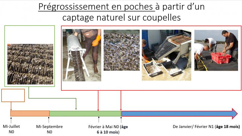 PrégrossissementVersion en ligne Cycle de prégrossissement après captage sur coupelles par Anne Massieu 1 Pose des coupelles 2 Captage 3 Coupelles captées sur parc de captage 4 Détrocage 5 Grattis: huîtres unes à unes 6 Criblage 7 Mise en poche du naissain et pose des poches 8 Prégrossissment en poches sur parcs surélevés
