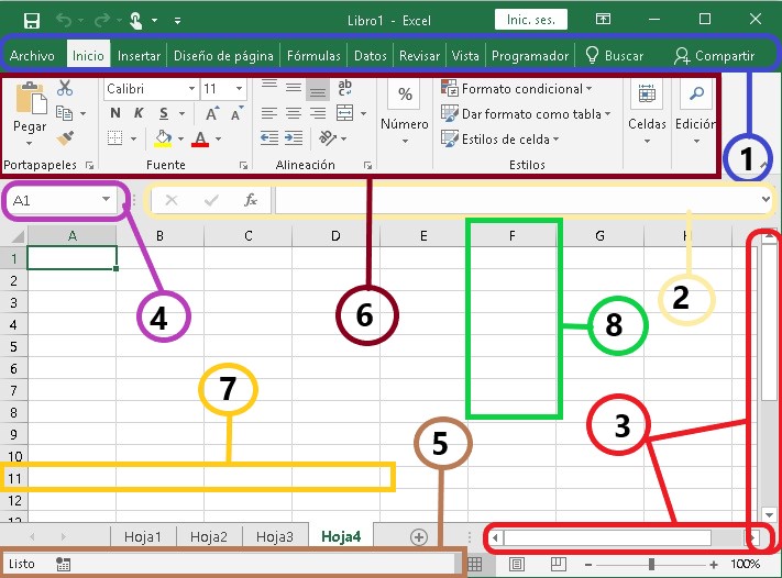 Entorno Microsoft Excel 2016 (D)Version en ligne Realizar este ejercicio te ayudara a conocer que has aprendido sobre el tema. par Yariela Hughes 1 Barra de menús 2 Cuadro de Nombres 3 Cinta de Opciones 4 Columna 5 Fila 6 Barra de formulas 7 Barra de estado 8 Barras de desplazamiento