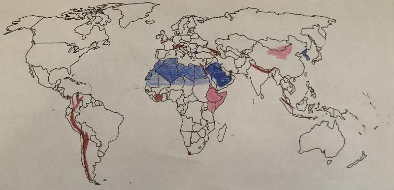 Physical/Geographic FeaturesVersion en ligne Point corresponds to surrounding color - Saharan Desert has two shades of blue and the lighter shade represents the extended area (some people only say the dark blue is the desert and others say both shades) par John Smith 1 Alps 2 Anatolia 3 Andes 4 Arabian Desert 5 Cape of Good Hope 6 Caucasus Mountains 7 English Channel 8 Gobi Desert 9 Gold/Ivory Coast 10 Himalayan Mountains 11 Horn of Africa 12 Korean Peninsula 13 Panama Canal 14 Saharan Desert 15 Strait of Hormuz 16 Strait of Malacca 17 Suez Canal 18 Tierra del Fuego