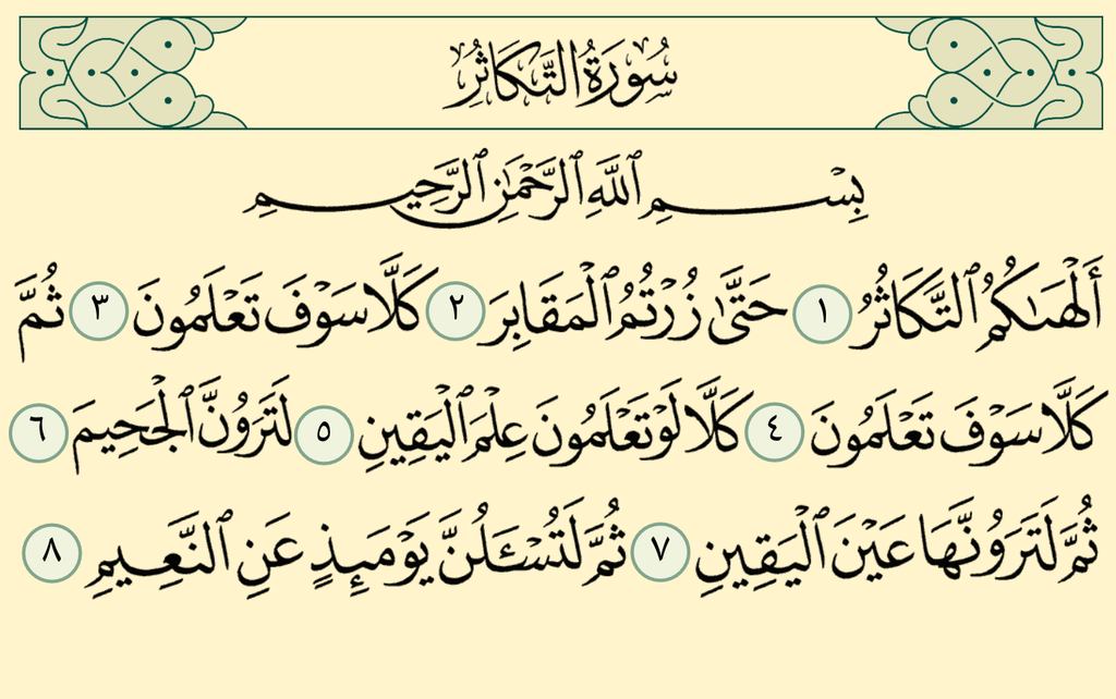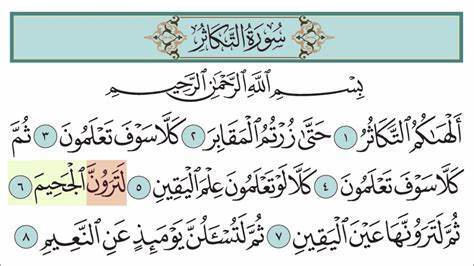 Froggy Jumps لعبة سورة التكاثرVersion en ligne اختبر معلوماتك عن سورة التكاثر في هذه اللعبة الممتعة! par Shereen Ibrahim Mohamed Ibrahim 1 ما اسم هذه السورة؟ a الضحى b التكاثر c القدر 2 ما هو عدد آيات سورة التكاثر؟ a 7 b 8 c 9 3 ما هو أول كلمة في سورة التكاثر؟ a ألهاكم b بسم الله c قل 4 أَلۡهَىٰكُمُ ٱلتَّكَاثُرُ" تعني" a انشغلوا بالأولاد فقط b انشغلوا بالأموال فقط c انشغلوا بالأموال والأولاد 5 كَلَّا لَوۡ تَعۡلَمُونَ عِلۡمَ ٱلۡيَقِينِ" اليقين يعني" a الشك b التأكيد c اللعب 6 لَتَرَوُنَّ ٱلۡجَحِيمَ الجحيم هو a الجنة b الدنيا c النار 7 ...ثُمَّ لَتُسۡـَٔلُنَّ يَوۡمَئِذٍ عَنِ a الحجيم b النعيم c اليقين