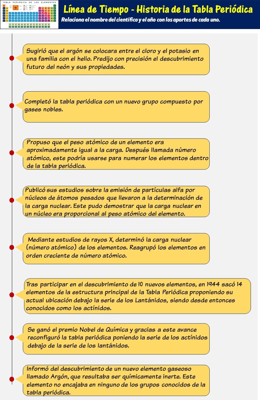 LA TABLA PERIÓDICA (organización de los elementos - Línea de Tiempo, 3ra parte)Version en ligne Relaciona los aportes para la organización de los elementos de la Tabla Periódica con los nombres de los científicos que contribuyeron, y las fechas de dicha contribución. par victor robles 1 1911 - A. van den Broek 2 Nov 28, 2016 - IUPAC 3 1951 - Glenn T. Seaborg 4 1913 - Henry Moseley 5 1904 - William Ramsey 6 1911 - Ernest Rutherford 7 1944 - Glenn T. Seaborg 8 1898 - William Ramsey