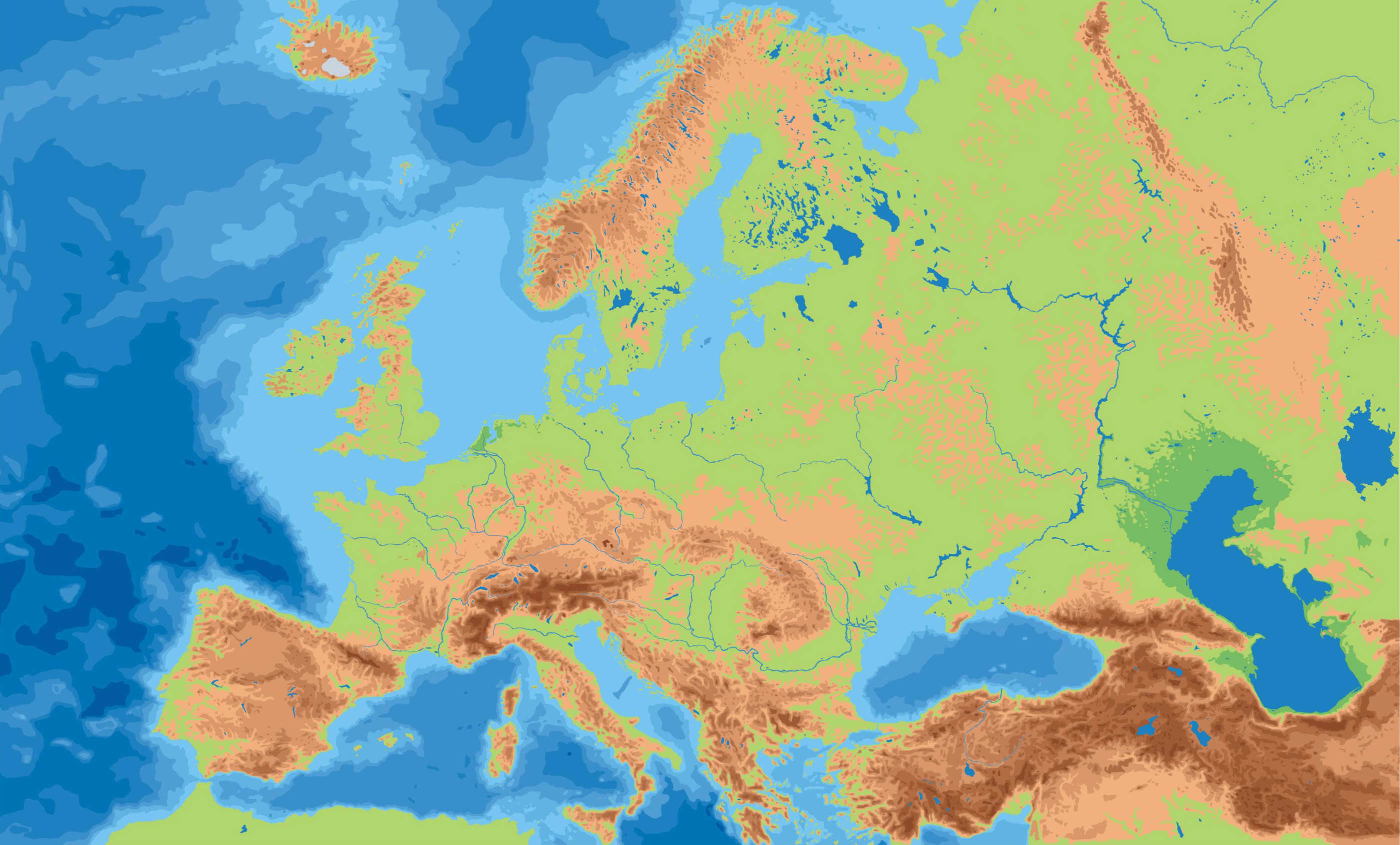 Mapa Físico del Relieve de EuropaVersion en ligne Montañas, penínsulas, islas, cabos y golfos en Europa par Pablo de Castro Fernández 1 Montes Escandinavos 2 Montes Urales 3 Pirineos 4 Alpes 5 Cárpatos 6 Balcanes 7 Cáucaso 8 Elbrús 9 Gran Llanura Europea 10 Macizo Central 11 Selva Negra 12 Península de Kola 13 Península Escandinava 14 Península de Jutlandia 15 Península Ibérica 16 Península Itálica 17 Península Balcánica 18 Península de Crimea 19 Isla de Islandia 20 Isla de Irlanda 21 Isla de Gran Bretaña 22 Islas Baleares 23 Isla de Córcega 24 Isla de Cerdeña 25 Isla de Sicilia 26 Cabo Norte 27 Cabo Fisterra 28 Cabo de San Vicente 29 Golfo de Botnia 30 Golfo Vizcaya 31 Golfo León