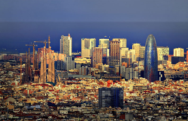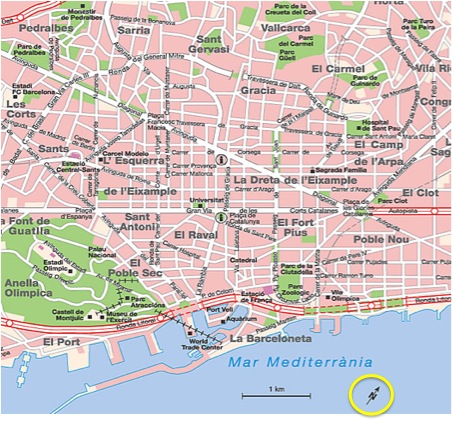 Considerando la orientación señalada en el mapa, ¿cuál es la ubicación del Mar Mediterráneo con respecto a la ciudad de Barcelona?