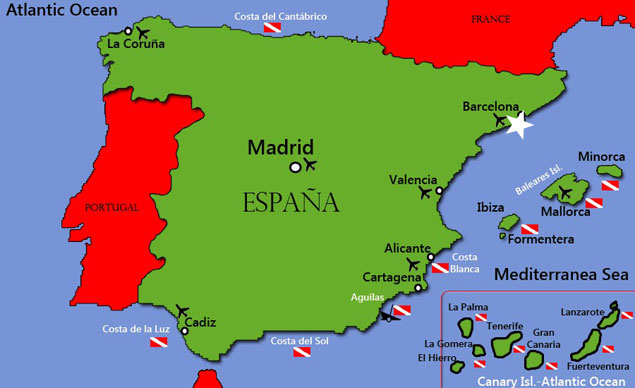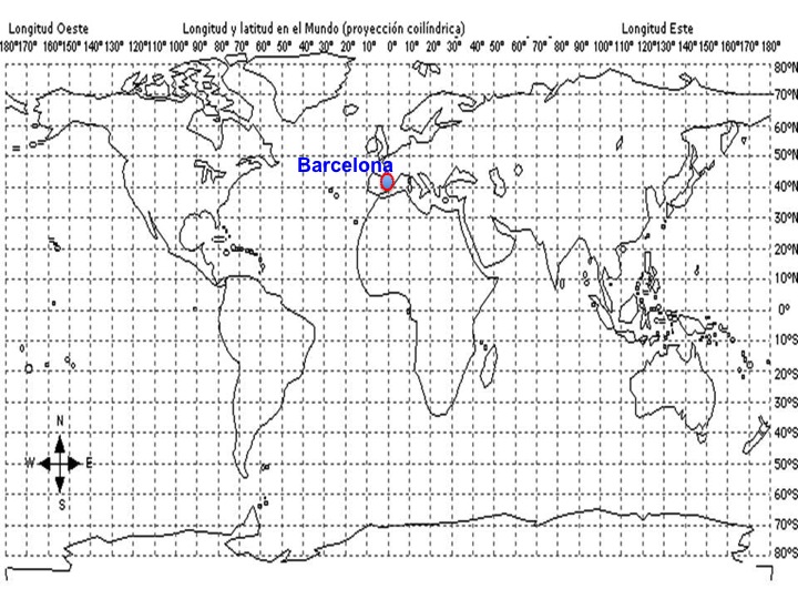 De acuerdo al mapa siguiente, ¿cuáles son las coordenadas de la ciudad de Barcelona, España?