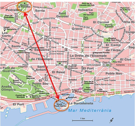 De acuerdo con la Escala indicada en el mapa de Barcelona, ¿cuál es la distancia que hay entre el Monasterio de Pedralba y el Word Trade Center, si existen 6 cm de distancia entre ellos en el mapa?