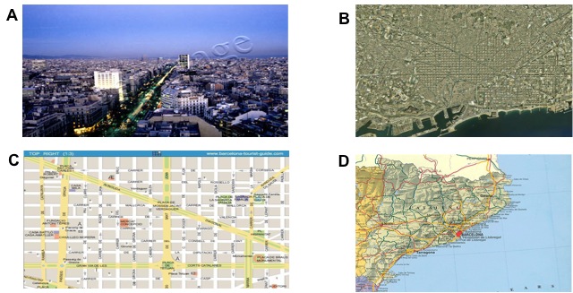 Las siguientes ilustraciones son algunos tipos de representación del Espacio Geográfico de Barcelona. Observándolas de izquierda a derecha, ¿cuál es el orden correcto?