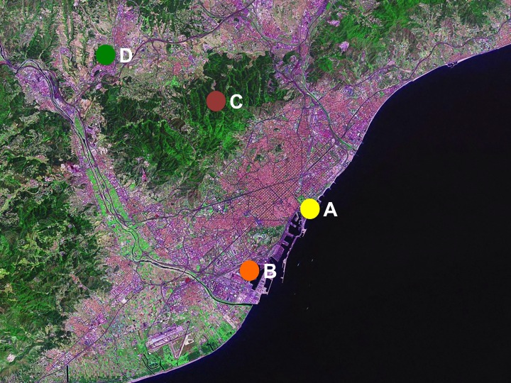 Si desearas construir una casa alejada de las inundaciones y deslaves continuos que sufre la ciudad de Barcelona. ¿Qué zona de las mostradas en la imagen satelital de Barcelona sería la más segura?