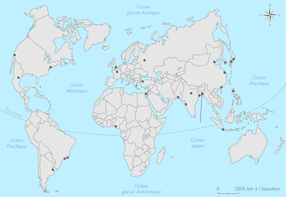 Carte des mégapolesVersion en ligne Clique sur le nom de la ville demandée. par Luc Moneyron 1 2 3 4 5 6 7 8 9 10 11 12 13 14 15 16 17 18 19 20 21 22 23 24 25 1 2 3 4 5 6 7 8 9 10 11 12 13 14 15 16 17 18 19 20 21 22 23 24 25 Explication 9 Capitale de la Russie mais aussi plus grande ville d'Europe (si on n'exclut Istanbul) avec 13 millions d'habitants. 21 Troisième ville indienne avec 15 millions d'habitants. 23 Première ville du Pakistan avec plus de 15 millions d'habitants, elle n'est cependant pas la capitale du pays. 24 Deuxième ville indienne, elle dépasse les 20 millions d'habitants.