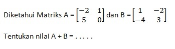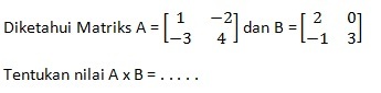 Froggy Jumps Tantangan Matriks MatematikaVersion en ligne Uji pengetahuanmu tentang matriks matematika dengan kuis ini! par Fitri Claudia Simanungkalit 1 Apa itu matriks dalam matematika? a Hanya digunakan dalam statistik. b Hanya angka tunggal. c Sekumpulan angka yang disusun dalam baris dan kolom. 2 Yang bukan termasuk macam - macam matriks adalah . . . . . a Matriks Persegi Panjang b Matriks baris dan matriks kolom c Matriks Identitas 3 Apa yang dimaksud dengan kesamaan dua matriks? a Mempunyai ordo yang sama b Mempunyai ordo yang sama dan elemen-elemen yang seletak nilainya juga sama c Elemen-elemen yang seletak nilainya sama 4 a b c 5 a b c 6 a 20 b 22 c 24 7 a b c 8 a 50 b 70 c 90 9 a b c 10 a b c