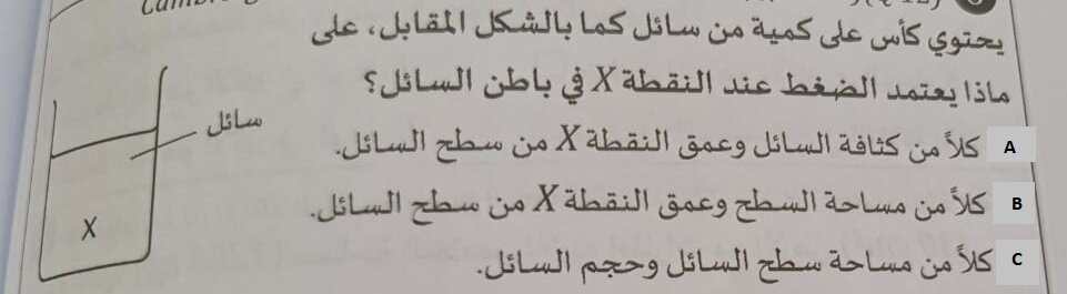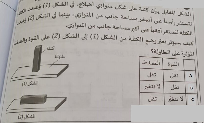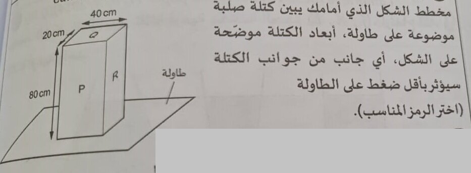 Froggy Jumps الضغطVersion en ligne لعبه الضفدع مع درس الضغط par Hala rashad 1 a A b B c C 2 a P b Q c R 3 a 0.83 N/m2 b 37000 N/m2 c 8.3 N/m2 4 a A b B c C 5 أي وضع من الآتي ستغوص فيه الشاحنة بأقل مقدار في تربة ناعمة؟ a شاحنة محملة ذات ست عجلات b شاحنة فارغة ذات أربع عجلات. c شاحنة فارغة ذات ست عجلات. 6 a S الماء يؤثر بأكبر ضغط على قاعدة الوعاء b P الماء يؤثر بأكبر ضغط على قاعدة الوعاء c الماء يؤثر بنفس الضغط على قاعدة كل وعاء