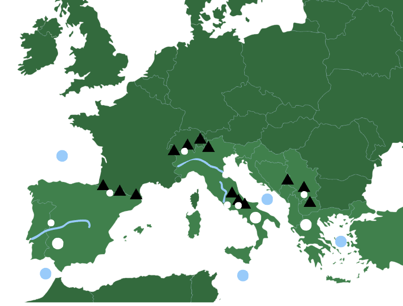 Southern Europe Physical FeaturesVersion en ligne Map Quiz par Sarah Mackintosh 1 Bay of Biscay 2 Tagus River 3 Iberian Peninsula 4 Strait of Gibraltar 5 PyreneesMountains 6 Alps 7 Po River 8 Tiber River 9 Apennines 10 Italian Peninsula 11 Mediterranean Sea 12 Adriatic Sea 13 Balkans 14 Balkan Peninsula 15 Aegean Sea