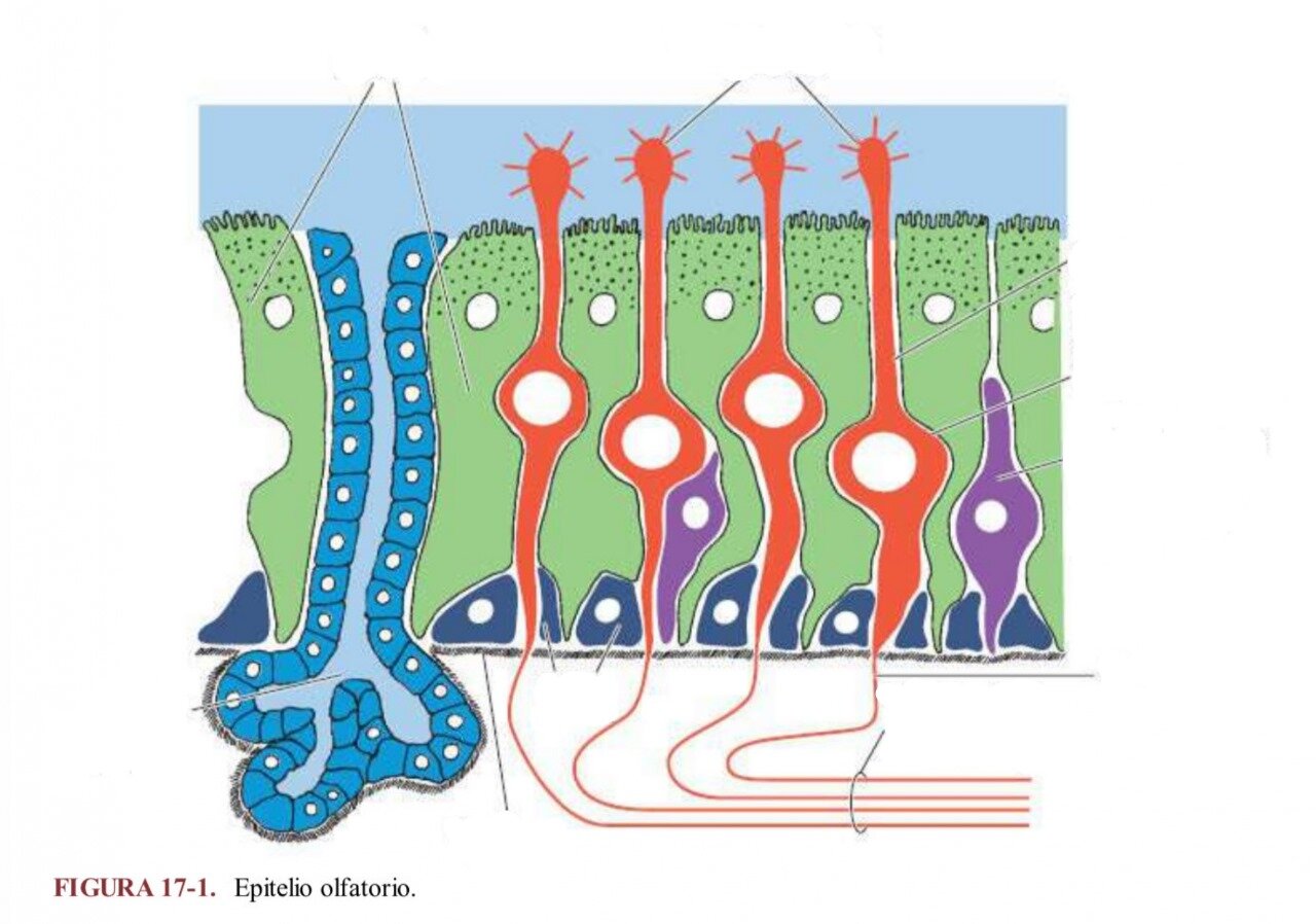 Barr 17-1Version en ligne Epitelio olfatorio par Gerardo Flores Guerrero 1 Células de sostén 2 Vesículas olfatorias con cilios 3 Dendrita 4 Célula neurosensorial olfatoria 5 Estadio intermedio 6 Axón 7 Hilo de los nervios olfatorios 8 Células basales 9 Membrana basal 10 Glándula olfatoria (Bowman)