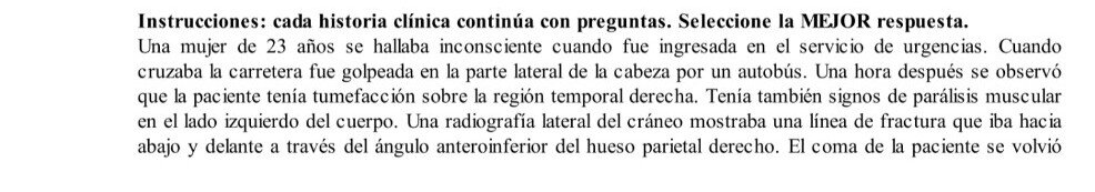Quiz de Neuroanatomía Pt1Version en ligne Conoce conceptos clave del sistema nervioso. par Teide Manzanilla 1 Explique el cambio en los síntomas y signos observados en este paciente: a El nervio ciático se hallaba comprimido en la pelvis por un cáncer rectal en expansión b El paciente presentaba aterosclerosis avanzada de las arterias de la extremidad inferior derecha c El proceso artrósico había producido osteofitos que invadían los agujeros intervertebrales, comprimiendo las raíces de los nervios raquídeos segmentarios. d Se había producido neuritis en el tronco del nervio ciático. 2 Explique las molestias en la región lumbar experimentadas por este paciente a Fatiga muscular. b Prolapso del disco intervertebral c Desgarro del ligamento en las articulaciones de la región lumbar de la columna vertebral. d Compresión de la cola de caballo. 3 Seleccione la causa más probable de parálisis muscular del lado izquierdo del cuerpo en esta paciente: a Laceración del lado derecho del hemisferio cerebral. b Hemorragia epidural del lado derecho. c Hemorragia epidural del lado izquierdo. d Lesión del hemisferio cerebeloso derecho. 4 La médula espinal tiene: a Diversos pares de nervios craneales. b Dos médulas paralelas. c Raíces de nervios separados para cada hemisferio. d Raíces anteriores y posteriores de un único nervio raquídeo unido a un único segmento. 5 La médula oblonga: a Tiene una cavidad llena de líquido. b Se encuentra dentro del cerebelo. c Es de una forma tubular. d Forma parte del mesencéfalo. 6 El mesencéfalo: a Posee una cavidad denominada acueducto cerebral. b No tiene cavidad alguna. c Se sitúa en la parte inferior de la médula. d Es la parte más externa del encéfalo. 7 El vermis es la parte que une: a las células de Purkinje. b los lóbulos del lóbulo temporal. c las fibras del diencéfalo. d los hemisferios cerebelosos. 8 Las siguientes aseveraciones se relacionan con el sistema nervioso periférico: a Solo hay siete pares cervicales. b Todos los nervios raquídeos emergen del cráneo. c No existen pares cervicales. d Hay ocho pares de nervios raquídeos cervicales. 9 Un nervio raquídeo está formado por: a La unión de una rama anterior y de una rama posterior en el agujero intervertebral. b La fusión de dos ramas anteriores. c Solo por una rama anterior. d Una sola raíz que atraviesa el foramen magno. 10 La cavidad presente dentro de cada hemisferio cerebral se denomina: a ventrículo cerebral. b subarracnoideo. c cisterna basilar. d septo pellucido. 11 Las siguientes aseveraciones se relacionan con el líquido cefalorraquídeo: a No está relacionado con la postura del paciente. b Con el paciente en posición de decúbito la presión normal es de 60 a 150 mmH2O. c La presión normal es de 10 a 20 mmH2O. d Siempre se mide en posición vertical. 12 Las siguientes aseveraciones se relacionan con los niveles vertebrales y los segmentos de la médula espinal: a La médula termina en el filum terminal a nivel L2. b La tercera vértebra cervical está situada frente al cuarto segmento cervical de la médula espinal. c El décimo segmento cervical coincide con la décima vértebra torácica. d La primera vértebra cervical está delante del tercer segmento cervical. 13 Seleccione la causa más probable de la tumefacción sobre la región temporal derecha en esta paciente: a Contusión superficial de la piel b Hemorragia de un vaso sanguíneo en el músculo temporal. c Rotura de los vasos meníngeos medios. d Edema de la piel. e Hemorragia de un vaso sanguíneo en la fascia superficial.
