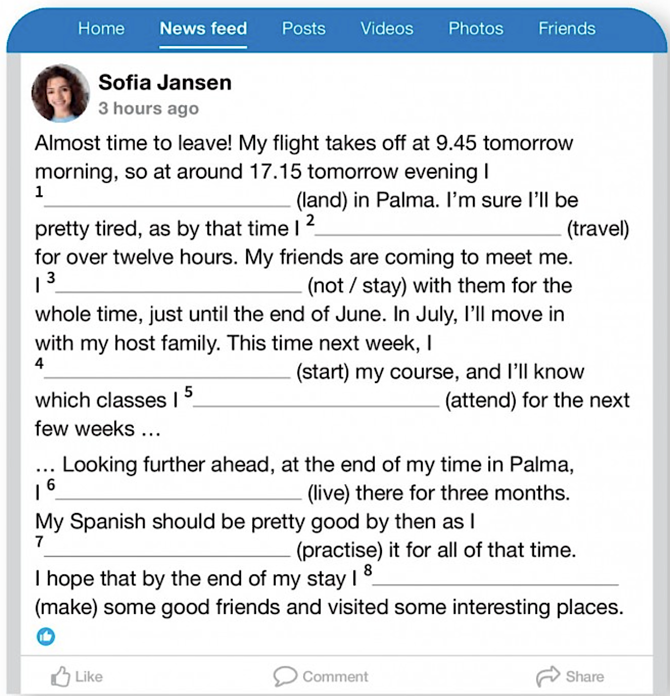 Future continuous, future perfect simple, future perfect continuousVersion en ligne Complete the post with the correct future form of the verbs in brakets. par K B 1 2 3 4 5 6 7 8 1 2 3 4 5 6 7 8 Explanation 1 "will be landing" is also possible 3 "won't be staying" is also possible