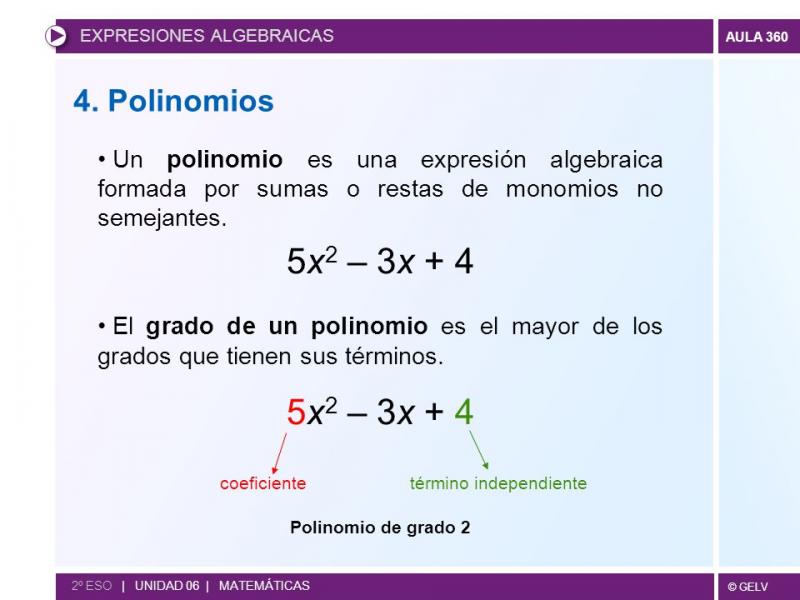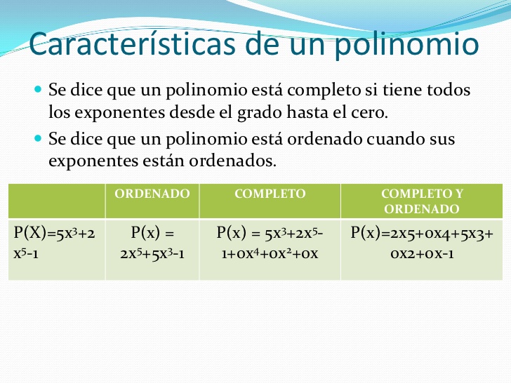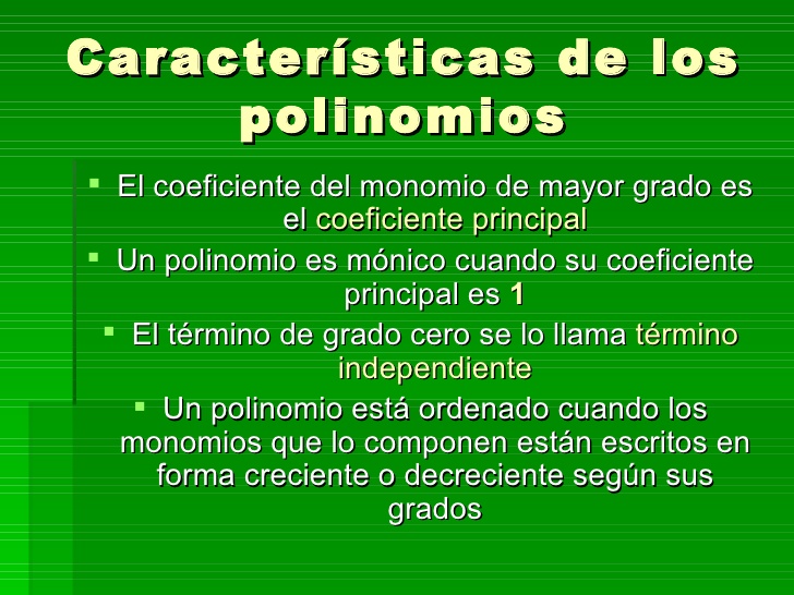 los polinomios Version en ligne es una expresión matemática constituida por una suma finita de productos entre variables (valores no determinados o desconocidos) y constantes (números fijos llamados coeficientes). Las variables pueden tener exponentes de valores definidos naturales incluido el cero y cuyo valor máximo se conocerá como grado del polinomio. En términos más simples, un polinomio es una suma de monomios. par jesus miguel del orbe 1 los polinomios 2 caracteristicas de los polinomios 3 caracteristica 4 caracteristica