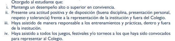 Actividad 1Version en ligne Actividad 1 par Mi proyecto MoQuba 1 Cuál de las siguientes opciones no es un objetivo del manual de convivencia? a Conocer y aplicar las normas y los procedimientos que orientan el buen funcionamiento de la Institución b Fortalecer los valores de la autonomía, el respeto por la diferencia y la tolerancia en cada individuo para alcanzar una convivencia armoniosa c Fortalecer procesos en torno a las medidas pedagógicas y alternativas de solución para las situaciones que afectan la convivencia escolar. d Promover y garantizar la violación de los Derechos Humanos y Derechos Humanos Sexuales y Reproductivos. 2 La siguiente imagen hace alusión a: a Objetivo del manual de convivencia b Objetivos de ley c Objetivos generales d Objetivos de la competencia 3 Cuáles de los siguientes símbolos son pertenecientes al manual de convivencia? Escoge una o varias respuestas a Escudo b Himno c La bandera d Uniforme 4 Seleccione a que tipo de reconocimiento anual pertenece la descripción de la imagen. a Deportista interno de cada seccion b Deportista externo de cada seccion c Reconocimiento artisitico d Otro reconocimiento 5 La siguiente imagen describe un deber estipulado en el manual de convivencia, es un deber que corresponde a: a Deberes de los Estudiantes b Deberes de los Docentes c Deberes de la Institución d Deberes de los padres de familia
