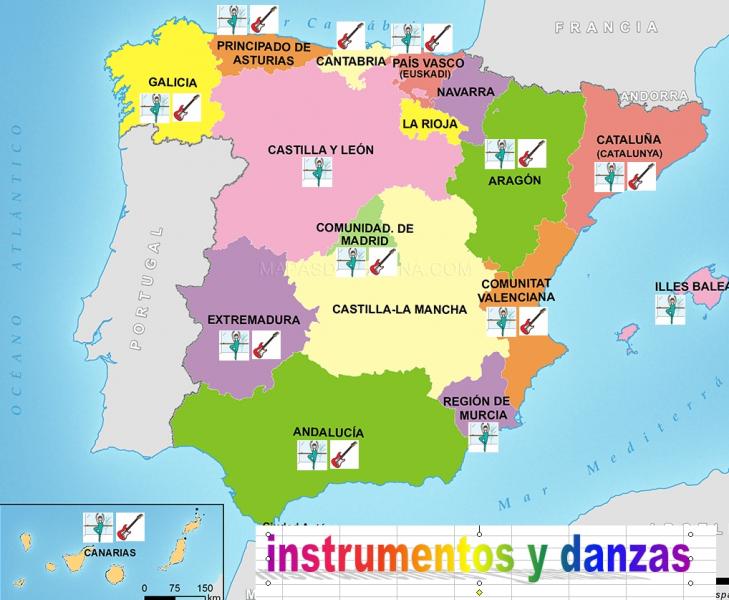 Mapa de Instrumentos y DanzasVersion en ligne mapa de España de instrumentos y danzas par María Dolores 1 Lage Veiga 1 muñeira, foliada 2 Gaita 3 prima danza, pericote 4 Gaita asturiana 5 Rabel 6 Aurresku, zortziko 7 Txistu 8 jota 9 Tambor de Calanda 10 Sardana 11 Flabiol 12 Paloteos 13 Chotis 14 Organillo 15 Son 16 Laúd 17 Sevillanas, seguidillas 18 Guitarras, castañuelas 19 Parranda 20 Alboradas, folies 21 Dulzaina, bandurria 22 Bolero, Baile de maitexes 23 Isa 24 Timple