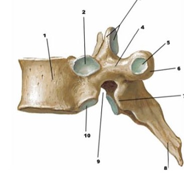 V. Toracica (Vista Lateral)Version en ligne Las doce vértebras torácicas son huesos fuertes que se ubican en el centro de la columna vertebral, es como una especie de sándwich entre las cervicales arriba y las vértebras lumbares. Al igual que las vértebras típicas, están separadas por discos intervertebrales. Sin embargo, son varias características anatómicas que las hacen bastante confusas en comparación con otros grupos de vértebras. par Jhon Meneses 1 Cuerpo Vertebral 2 Faceta Costal Superior 3 Faceta Articular Superior 4 Pediculo 5 Faceta Costal Transversa 6 Proceso Transverso 7 Faceta Articular Inferior 8 Proceso Espinoso 9 Escotadura Vertebral Inferior 10 Faceta Costal Inferior