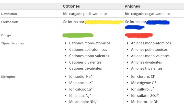 Cationes y anionesVersion en ligne Responde las preguntas par MONIK PINTO 1 Un cation es a Ión cargado negativamente b Ión cargado positivamente c Una pérdida de electrones d Una ganancia de electrones 2 Un anion es a Un ion cargado negativamente b Una pérdida de electrones c Una ganancia de electrones d Un ion cargado positivamente 3 El espacio de color amarillo corresponde a Respuesta escrita 4 El espacio de color azul corresponde a Respuesta escrita 5 El espacio de color verde corresponde a Respuesta escrita 6 El espacio de color rojo corresponde a Respuesta escrita 7 Un anión monoatómico divalente es a b c d 8 Un anion monoatómico monovalente es a b c d 9 Un anión poliatómico es a b c d 10 Un anion monoatómico trivalente es a b c d