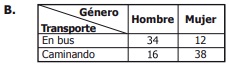En una fábrica se aplica una encuesta a los empleados para saber el medio de transporte que usan para llegar al trabajo, y luego decidir si se implementa un servicio de ruta. Los resultados mostraron, entre otras, estas tres conclusiones sobre un grupo de 100 empleados que viven cerca de la fábrica y que se desplazan únicamente en bus o a pie: • El 60% del grupo son mujeres. • El 20% de las mujeres se desplazan en bus. • El 40% de los hombres se desplazan caminando. ¿Cuál de las siguientes tablas representa correctamente la información obtenida de ese grupo?