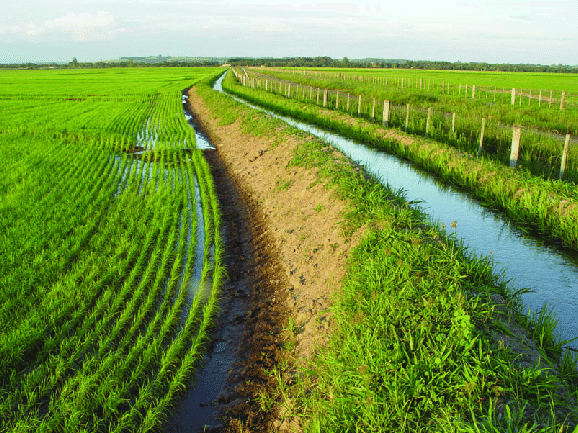 Os canais de irrigação são pequenos caminhos que levam a água do rio até as plantações.