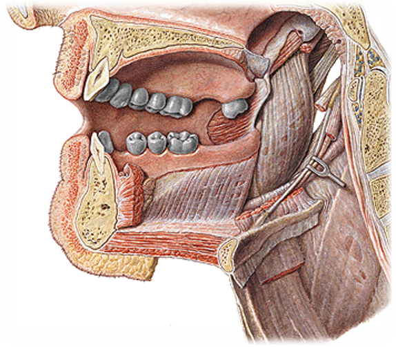 APARATO ESTOMATOGNÁTICO 4Version en ligne El aparato estomatognático es el conjunto de órganos y tejidos que permiten las funciones fisiológicas de comer, hablar, masticar, deglutir, pronunciar, sonreir, besar. par Vania Illanes Quiroga 1 Músculo milohioideo 2 Cuerpo de la mandíbula 3 Hueso hioides 4 Músculo genihiodeo 5 Músculo geniogloso 6 Apófisis palatina del hueso maxilar 7 Lámina horizontal del hueso palatino 8 Mucosa palatina 9 Mucosa yugal 10 Músculo buccinador 11 Músculo semiorbicular superior de los labios 12 Músculo semiorbicular inferior de los labios