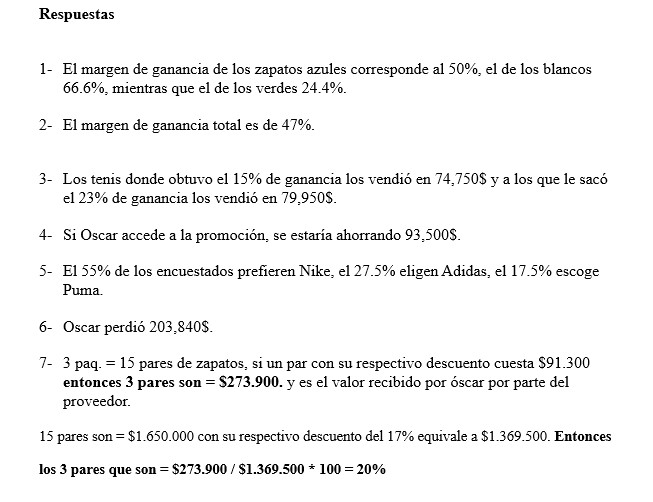 1- El margen de ganancia de los zapatos azules corresponde al 50%, el de los blancos 66.6%, mientras que el de los verdes 24.4%.