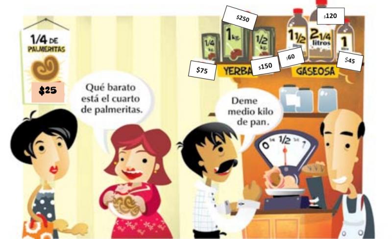 ¡En las compras!Version en ligne Repartos Partición Fracciones par Magui Rodriguez 1 Si Matías lleva una gaseosa de dos litros y cuarto, ¿ Cuánto tiene que pagar? a 60 b 120 c 45 2 Juana quiere comprar 3 litros de gaseosa ¿Qué botellas puede llevar? Escoge una o varias respuestas a Botellas de 1 litro b Botellas de 2 1/4 c Botellas de 1 1/2 3 Si Pedro lleva 4 paquetes de 1/2 kilo de yerba. ¿Lleva más o menos que 3 kilos? a Lleva más de 3 kilos b Lleva menos de 3 kilos 4 ¿ Cuánto gastará Matilde si lleva 1 kilo de palmeritas? a $25 b $75 c $100 d $50 5 ¿Cuánto gastará Ana si lleva 3/4 de palmeritas? a $50 b $75 c $100 d $25 Explicación 1 Reparto 4 Reparto 5 Reparto