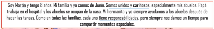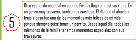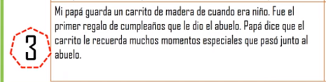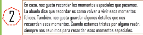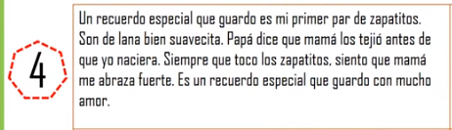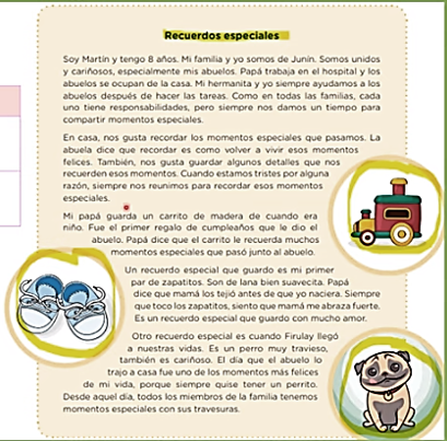 NUESTRO RECUERDOS ESPECIALESVersion en ligne En nuestras familias y comunidad, vivimos diferentes momentos que recordamos con alegría o tristeza. Guardamos momentos, los atesoramos y rememoramos, porque ellos movilizan nuestras emociones y permiten que nos mantengamos unidos. Todo esto es parte de la historia personal y familiar de los niños y las niñas, y forma parte de su ciclo de vida. Recordar estos momentos los fortalecerá para seguir avanzando con optimismo. par rosario Olaechea Coria 1 ¿Cuántos párrafos tiene el texto? a 4 párrafos b 5 párrafos c 3 párrafos d 6 párrafos 2 ¿De qué trata el Primer párrafo? a Trata de Martín y su familia son unidos y cariñosos y comparten momentos especiales. b Trata sobre la Familia del abuelo que tiene a su familia muy lejos c Trata del carrito de papá que le trae recuerdos especiales. d Trata de la familia de mamá sobre sus recuerdos especiales. 3 ¿De que trata el segundo párrafo? a Trata sobre la llegada del perro Firulay a la familia b Trata sobre el carrito de papá que lo regalo. c Trata de que le gusta recordar muchos momentos especiales d Trata de la familia de mamá sobre sus recuerdos especiales. 4 ¿De qué trata en el tercer párrafo del texto? a Trata del cumpleaños de papá. b Trata de los momentos especiales que pasó junto a sus vecinos. c Trata del papá que guarda su bicicleta como recuerdo. d Trata de que el papá dice que el carrito le recuerda muchos momentos especiales 5 ¿De qué trata el párrafo cuatro? a Sobre un recuerdo especial que guardo mi primer carrito. b Sobre un recuerdo especial que guardo es mi primera bicicleta. c Sobre mi primer recuerdo especial es mi primer par de zapatitos que guardo con mucho amor y cariño. d Sobre un recuerdo especial cuando me regalaron mi primera mascota. 6 ¿De qué trata el quinto párrafo del texto? a Trata sobre recuerdo especial de cuando me compraron mi primera pelota. b Trata sobre un recuerdo especial de mi primera zapatillas. c Trata sobre un recuerdo especial de cuando llegó Firulay a nuestras vidas. d Trata sobre un recuerdo especial cuando nació mi hermanita
