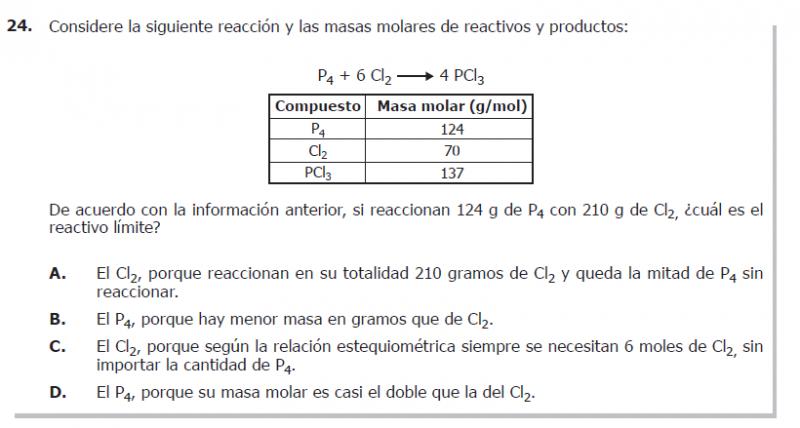 De acuerdo con la información anterior, si reaccionan 124 g de P4 con 210 g de Cl2, ¿cuál es el reactivo límite?
