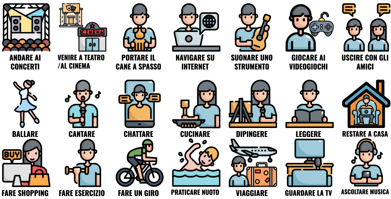 PG1 Il Tempo LiberoVersion en ligne Inserisci i verbi dati: andare al cinema, ascoltare musica, andare in bicicletta, cucinare, dipingere, fare lo jogging, fare una passeggiata, fare shopping, fotografiare, giocare ai scacchi, guardare la TV, il giardinaggio, incontrare amici, leggere, navigare su internet, viaggiare, visitare un museo, scrivere, suonare uno strumento sotto l'immagine giusta. par LUISA GUADALUPE ARELLANO CARRASCO 1 ANDARE AI CONCERTI 2 ASCOLTARE MUSICA 3 BALLARE 4 CANTARE 5 CHATTARE 6 CUCINARE 7 DIPINGERE 8 FARE SHOPPING 9 FARE ESERCIZIO 10 FARE UN GIRO 11 GIOCARE AI VIDEOGIOCHI 12 GUARDARE LA TV 13 LEGGERE 14 PORTARE IL CANE A SPASSO 15 NAVIGARE SU INTERNET 16 RESTARE A CASA 17 SUONARE UNO STRUMENTO 18 USCIRE CON GLI AMICI 19 VENIRE AL CINEMA/TEATRO/MUSEO/BAR 20 VIAGGIARE 21 PRATICARE NUOTO Spiegazione 1 Ir a conciertos 2 Escuchar música 3 BAILAR 4 cantar 5 CHATEAR 6 COCINAR 7 PINTAR 8 IR DE COMPRAS 9 HACER EJERCICIO 10 DAR UNA VUELTA 11 JUGAR A LOS VIDEOJUEGOS 12 VER LA TELEVISION 13 LEER 14 PASEAR AL PERRO 15 NAVEGAR EN LA RED 16 QUEDARSE EN CASA 17 TOCAR UN INSTRUMENTO 18 SALIR CON LOS AMIGOS 19 VENIR AL CINE 20 VIAJAR