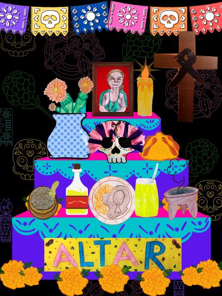 Altar de muertosVersion en ligne Observa la presentación de los elementos del altar y después, juega con ellos par Stephanie Ingried Montoya Leal 1 altar de muertos 2 foto 3 vela 4 flor 5 cruz 6 calaverita 7 comida 8 bebida 9 sal 10 copal 11 ceniza