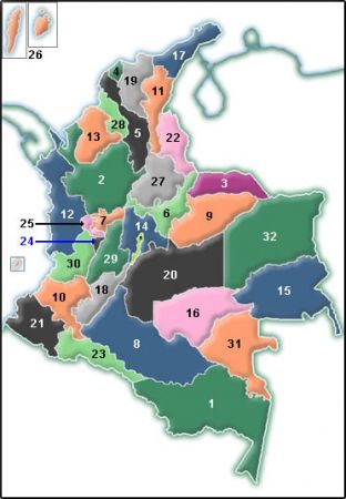 Los Departamentos de Colombia.Version en ligne En esta actividad deberás descubrir todos los departamentos de Colombia y resolver cada parte del mapa. par Santiago Lozano 1 Tolima 2 Amazonas 3 Vaupés 4 Antíoquía 5 Arauca 6 Magdalena 7 Bolivar 8 Boyaca 9 Caldas 10 Caqueta 11 Casanare 12 Cauca 13 Cesar 14 Chocó 15 Córdoba 16 Cundinamarca 17 Guainía 18 Guaviare 19 Guajira 20 Huila 21 Atlántico 22 Meta 23 Nariño 24 Norte de Santander 25 Putumayo 26 Quindio 27 Risaralda 28 Santander 29 Sucre 30 Valle del Cauca