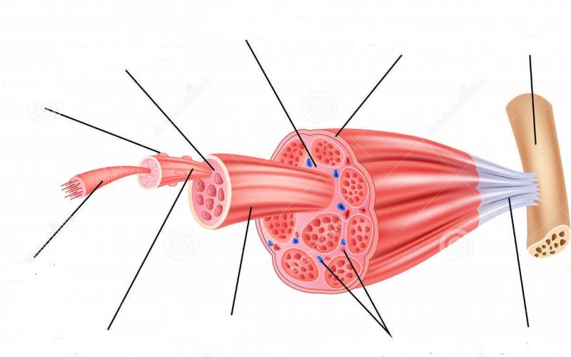 Estructura del músculo.Version en ligne Completa la imagen. par Lorena Recanzone 1 Hueso 2 Epimisio 3 Perimisio 4 Endomisio 5 Núcleo 6 Miofibrilla 7 Fibra muscular 8 Fascículo 9 Vasos sanguíneos 10 Tendón